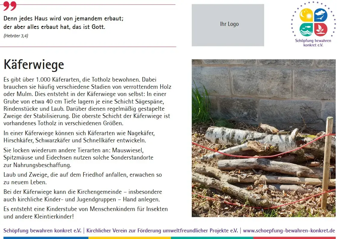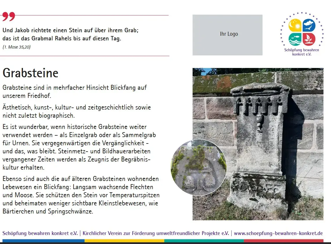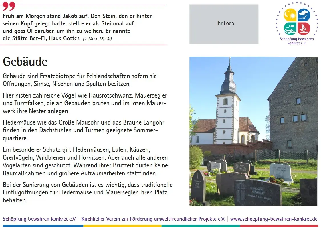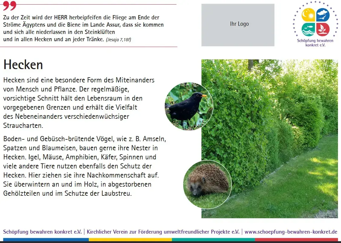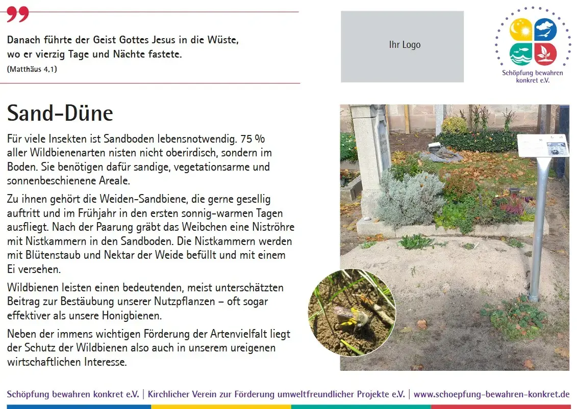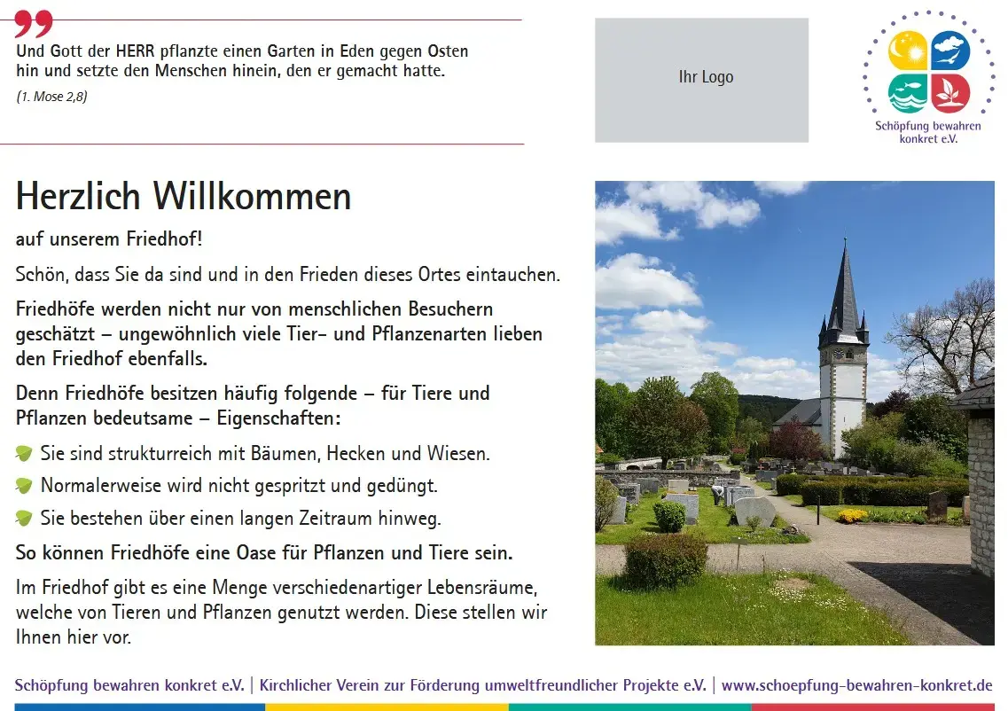 Inzwischen bietet der Verein eine Sammlung von 17 Lebensraumtafeln an, die Sie in Ihrem Friedhof oder einem anderen kirchlichen Grundstück aufstellen können. Auf den Tafeln werden nicht nur die verschiedenen Lebensräume erklärt und mit einem Foto anschaulich gemacht, es wird auch ein Bezug zur Bibel hergestellt. Zu jedem Lebensraum gibt es einen passenden Bibelspruch.