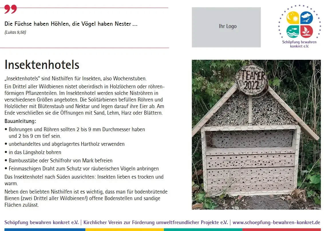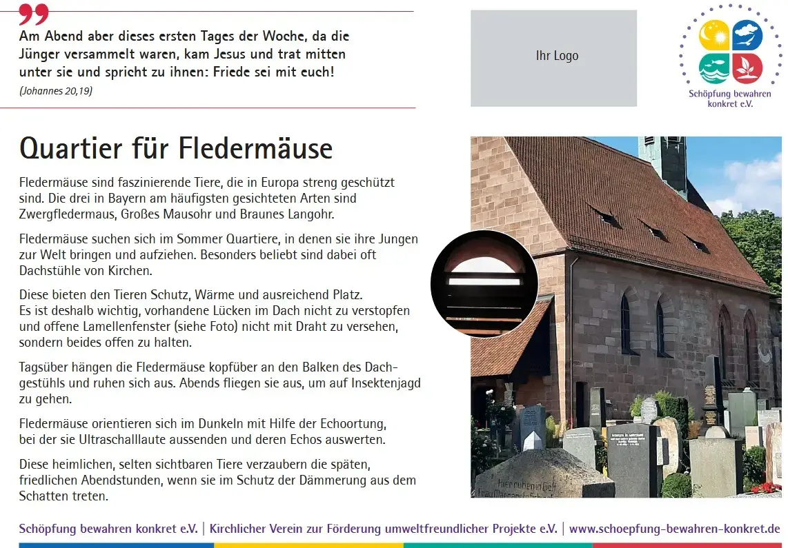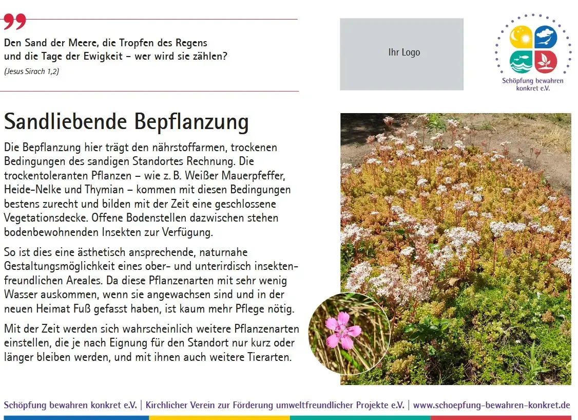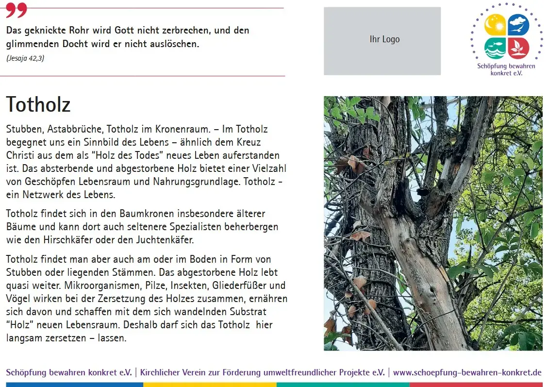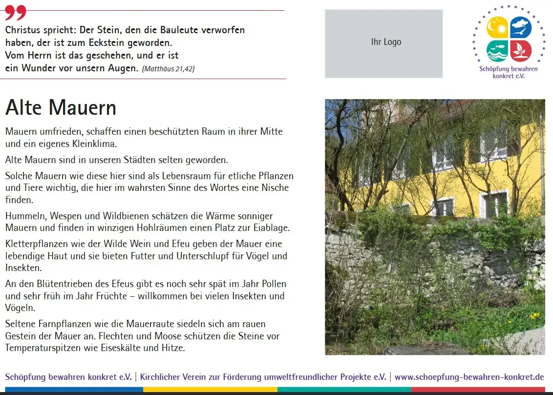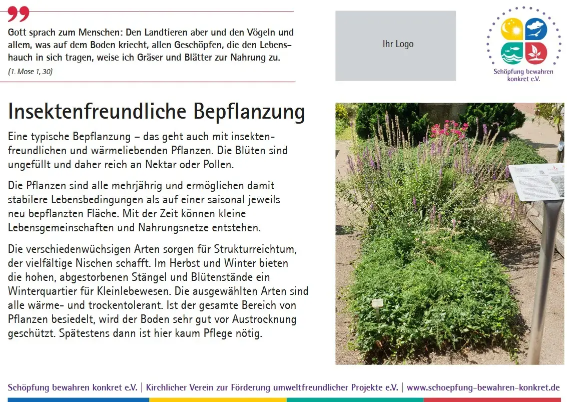 Inzwischen bietet der Verein eine Sammlung von 17 Lebensraumtafeln an, die Sie in Ihrem Friedhof oder einem anderen kirchlichen Grundstück aufstellen können. Auf den Tafeln werden nicht nur die verschiedenen Lebensräume erklärt und mit einem Foto anschaulich gemacht, es wird auch ein Bezug zur Bibel hergestellt. Zu jedem Lebensraum gibt es einen passenden Bibelspruch.